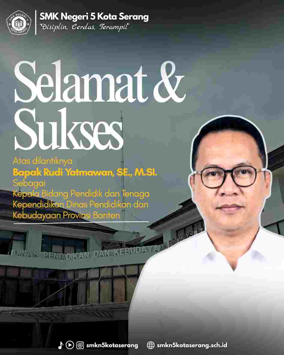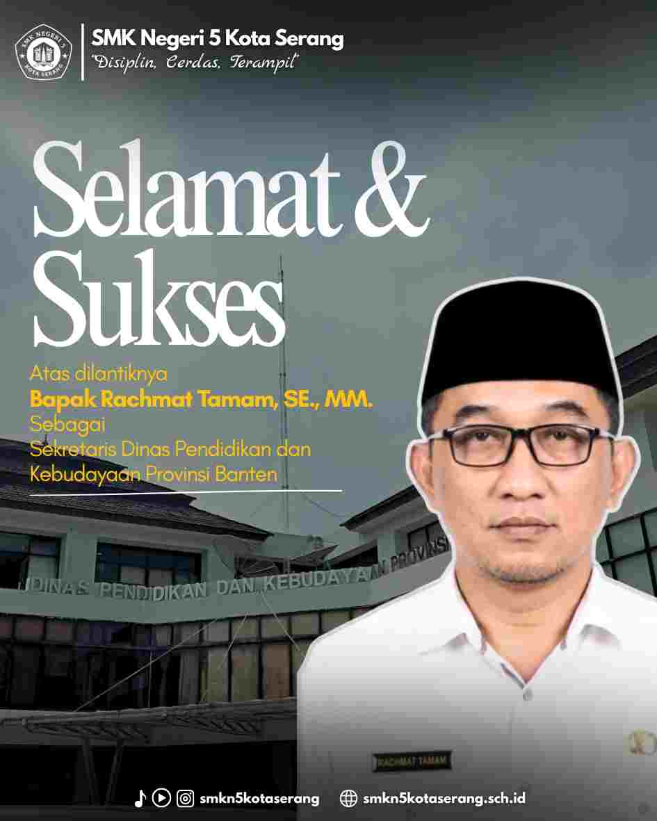 Kami segenap keluarga besar SMKN 5 Kota Serang mengucapkan selamat atas dilantiknya Bapak Rachmat Tamam, SE., MM. sebagai Sekretaris Dinas Pendidikan Provinsi Banten dan Bapak Rudi Yatmawan, SE., M.SI. sebagai Kepala Bidang Pendidik dan Tenaga Kependidikan Dinas Pendidikan Provinsi Banten.